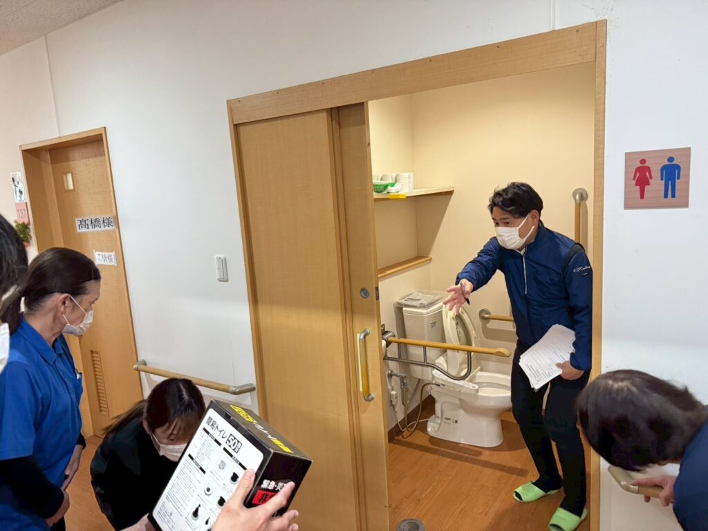 当日はライフラインの停止を想定し、BCP策定支援の過程でご準備いただいた非常用発電機の操作方法や電源供給方法、職員・利用者さんの非常用トイレの利用方法等、いくつかのシチュエーションを設定し、職員の皆様に実際に試していただきました。